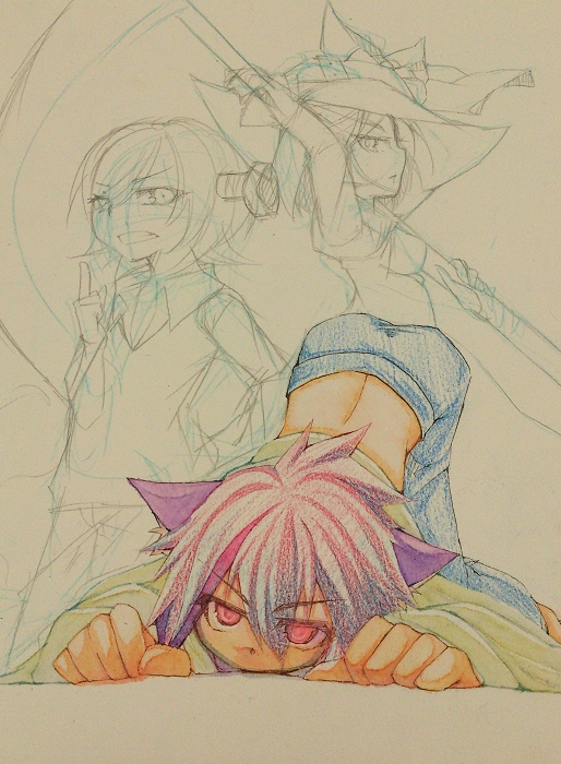 今回はスケブ真っ白な状態からの前半お話イメージが何となく沸いて来たあたりからラフ下書き清書色塗りとココまで進みました。