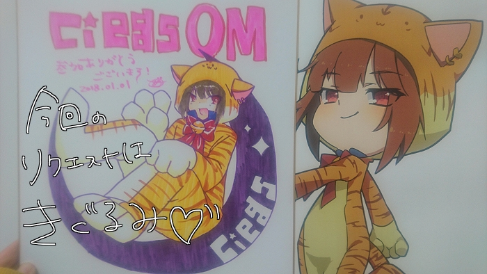 当日のあみだくじによる色紙プレゼントでは当選された方のリクエスト(チィ、コテツ、きぐるみ、古丹(主催)の中から1人)をその場でお描きしプレゼントいたします。