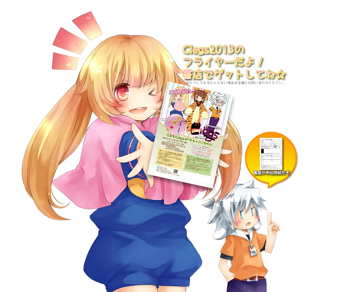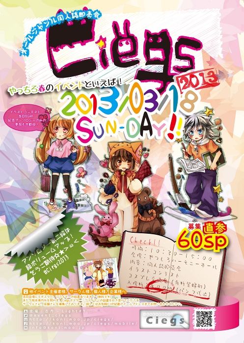 2026/04/06 03:24 [PR] ×[PR]上記の広告は3ヶ月以上新規記事投稿のないブログに表示されています。新しい記事を書く事で広告が消えます。 [PR] の続きを読む お知らせ 2012/10/26 08:23 不在のお知らせ 私情のため本日から暫くパソコンが触れない状況となります。メールの返信などは12月頭頃から順次急ぎ対応致します。お急ぎの用のある方へは大変ご不便をおかけ致しますがご承知頂ければ幸いです。 PR 不在のお知らせ の続きを読む お知らせ 2012/10/25 17:24 2013ポスター ジャンッ!☆ということで完成しました。原寸大はA1。大きすぎてなかなか受付けて頂けないので泣く泣くA3で出力しなおして営業回りしてます。(´;ω;)ウッ…A1でも全然いいよと引受けてくださる場所を絶賛募集しております…。笑A3サイズもご用意いたしましたのでA3を引き受けても下さる店舗さん、サークルさん宜しくお願いいたします! 2013ポスター の続きを読む お知らせ 2012/10/19 18:18 web企画 - 塗り絵 Pixivにてweb企画 塗り絵 についてアップしました!詳しくは画像をクリック!※Pixivのページに飛びます。 web企画 - 塗り絵 の続きを読む お知らせ 2012/10/18 15:51 Ciegs2013フライヤー ファースト文庫八代店様、メロンブックス秋葉原店様、福岡店様、小倉店様、熊本店様にて設置・配布をお願いしております。今年から経費削減(´^0^`)のため裏面がサークル、イラストコンテストの申込用紙となっております。サークル、イラストコンテスト共々、地球上と言わず宇宙全圏より参加大歓迎です!奮ってご応募ください! Ciegs2013フライヤー の続きを読む 雑談 2012/10/14 20:03 サークル様へアンケートのお願い 日本全国の同人活動をされているサークル様!お手隙の際にでもちょっとアンケートにご協力いただけませんか?集計結果はCiegs2013にて発行のアンソロジー「#Ciegs2013」にて発表です!詳しくは画像をクリック☆*アンケート〆切 2013年11月30日(金) サークル様へアンケートのお願い の続きを読む